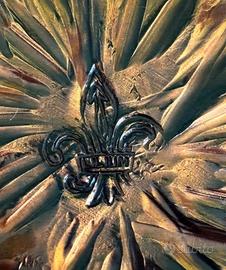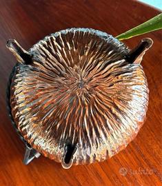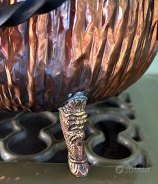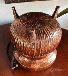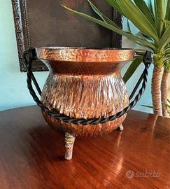 Antico calderone in rame Lilium (marchiato sul fondo) fatto a mano in Italia, una piccola opera d'arte luccicante. Il corpo è lavorato in modo particolare, diverso da quello del collo; è un treppiede e le gambe sono lavorate con un rimando antropomorfo. Può essere utilizzato in vari modi, noi lo abbiamo usato sopra la stufa a legna per umidificare l'ambiente. È molto bello e lucido e si adatta perfettamente a una cucina rustica o appeso alle travi di un ristorante. Pesa circa 825 gr ed è largo, con manici, 26 cm e alto 19. NON ADATTO ALLA CUCINA. #liliumcopper #madeinitaly #vintage #lilium #pentolone #rare #calderone #cauldron #rame