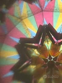 Caleidoscopio in cartone rigido con rivestimento decorativo a motivi floreali colorati. Lunghezza circa 20 cm. Completo e funzionante, crea suggestivi giochi di luce e forme geometriche. In buone condizioni generali, ideale come oggetto vintage o regalo originale.