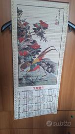 Calendario murale originale del 1981 in stile orientale, formato pergamena arrotolabile con supporti in legno. Oggetto decorativo in buone condizioni, risalente presumibilmente agli anni ’70-‘80. Calligrafia orientale, scritte in italiano, illustrazioni tradizionali cinesi con figure umane, e cordino per appenderlo. Wooden wall scroll (calendario decorativo in legno/bambù da muro). Pezzi da collezione: ultimi rimasti. Misure: 32x85 (secondo pezzo 32x75 ma rovinato). Prezzo trattabile