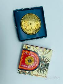 Calendario perpetuo circolare in ottone con quadrante inciso e ghiera girevole, contenuto nella sua scatola originale illustrata “The Compass Rose Collection”. Il quadrante permette di calcolare