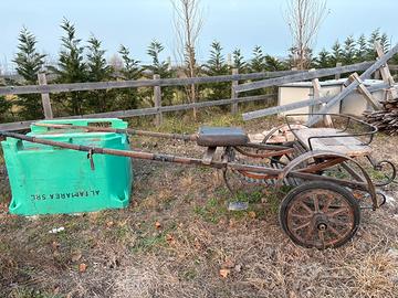 Vendo calesse d’epoca a due ruote per cavallo, in legno e ferro, con stanghe e sedile originale.
