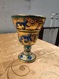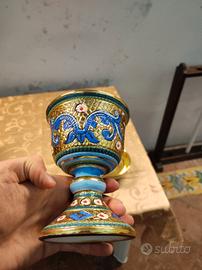 calice e pisside fatti a mosaico, il colore principale è l'oro poi ci sono altri colori che accompagnano queste fantastiche decorazioni. sono in buone condizioni