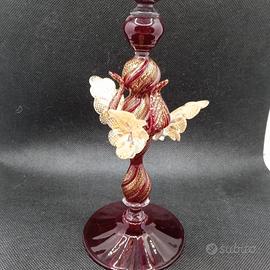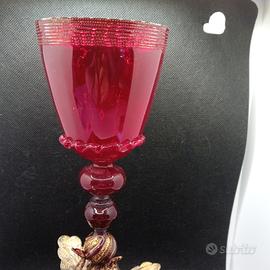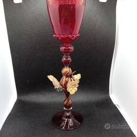 Bellissimo bicchiere/ Coppa in vetro soffiato colr Rubino e oro zecchino. Lavorazione eccellente con fiori sullo stelo. Manifattura Murano. Epoca Liberty. Dimensioni altezza 28,5 cm larghezza 5,5 cm.
