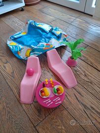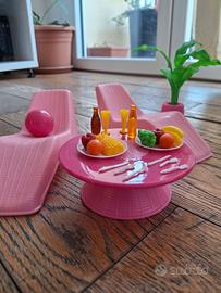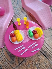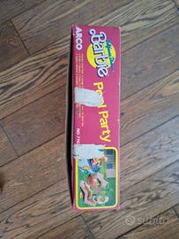 California Dream Barbie Pool Party 1987 set completo 25 pezzi. La scatola è integra, in buone condizioni per l'età, salvo da un lato una strappatura da nastro adesivo. Strappatura presente anche su un lato corto. Il set è conservato in maniera veramente incredibile: la piscina, le sdraio, il tavolo, tutto è intonso e ancora del colore originale. Non presentano sbrecciature o danni. I pezzi sono tutti e 25 comprensivi di: piscina, 2 sdraio, 1 palla, 1 pianta, 1 tavolo, 2 piatti, 6 posate, 2 bicchieri, 2 bottiglie e la frutta (ananas, 2 mele, 2 arance, banana).
