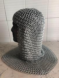 gli anelli in acciaio zincato su questa protezione per il collo in cotta di maglia sono collegati insieme da fabbri utilizzando la tecnica europea ad incastro