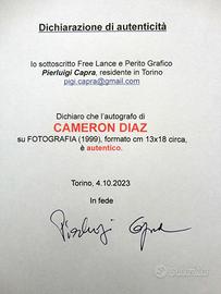 Il cimelio è accompagnato da Dichiarazione di Autenticità rilasciato dal grafico, scrittore ed esperto collezionista di autografi Pierluigi Capra, cui detiene una della più importanti collezioni di autografi Internazionali tra attori, cantanti,sportivi, politici ecc., raccolti durante svariati anni.