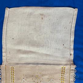 Antica camiciola da donna in lino grezzo completa di busta per riporla. Tutto ricamato a mano da corredo inizio ‘900. Ottimamente conservata malgrado l’età, presenta ingiallimenti del tempo. La busta chiusa di cm 40X31, è foderata internamente in seta gialla e viene consegnata fatta lavare a secco. Per un regalo senza tempo.