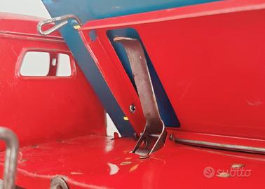 Camion in lamiera fine anni ’40 inizio ’50, prodotto durante il periodo dell’occupazione Alleata nella Germania Ovest. Avanzamento con meccanismo a molla e chiave di caricamento - marchio Gescha. Azionando una manovella è possibile ribaltare il cassone sul lato destro o verso il fondo del camion con apertura della sponda posteriore. Una leva anteriore consente di regolare la curvatura del percorso. Gli pneumatici sono in gomma piena. Tutto funzionante. Misure: lunghezza 36 cm, larghezza 12 cm, altezza 13 cm.