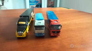 Tre modellini di camion marca Italeri: Pirelli, Mercedes-Benz, Euro. Metallo e plastica. Ottime condizioni, praticamente perfetti. Segnalo solo un difetto ad uno specchietto del camon "Euro" (vedi foto). Pirelli lungo 22 cm, Mercedes 18, euro 16. Lunghi circa 15 cm.