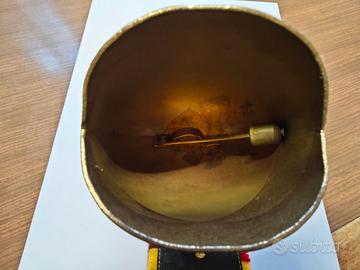 Campana per bestiame in bronzo fuso, svizzera originale. Una campana per bestiame in bronzo fuso con battacchio in bronzo dipinta a mano con motivi floreali montani, con 2 fregi in ottone sulla cintura e uno in pelle con l'emblema svizzero. La campana ha il suo cinturino originale in pelle marrone arricchito da frange vivaci (rosso, verde, giallo, bianco). Un autentico pezzo che porterà la campagna svizzera nella tua casa. Lunghezza cinghia: 42 cm., larghezza cinghia 9 cm., altezza Campana 13 cm., diametro larghezza 12 cm., Peso kg. 0,530 Nessun segno di usura.