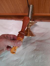Bellissima, particolare, campana tibetana in bronzo, a doppia coppa, con manico scultura, contenente un porta incenso avvitato. Alta 18 cm x 10 cm pesa 425 grammi.