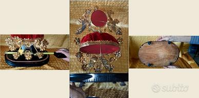 Antico globo nuziale contenente il bouquet della sposa, la corona di fiori, gli orecchini e altri ornamenti, tra cui un cuscino di velluto rosso, specchi incisi e motivi floreali e di uccelli in metallo dorato, il tutto poggiato su una base di legno annerito. Storicamente, il globo nuziale è un'usanza che risale alla fine del XIX secolo. Il giorno dopo le nozze, la sposa deponeva il suo bouquet e la corona nuziale, composta da fiori d'arancio come simbolo di purezza e verginità, sotto una cupola di vetro.