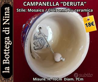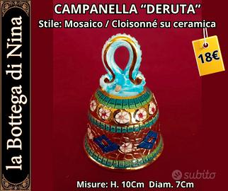 Deliziosa campanella in ceramica autentica di Deruta (Umbria, Italia), realizzata con la pregiata tecnica del lustro oro a mosaico, stile Cloisonné. Caratteristiche: Altezza: 10 cm | Diametro: 7 cm Fondo oro brillante con motivi a mosaico Decorazioni in blu cobalto, turchese, rosso e bianco Fiori bianchi con cuore rosso Manico smaltato turchese Batacchio originale in ceramica integro Marchio originale Deruta sul fondo Dipinta a mano da artigiani umbri Perfetta da collezione, come souvenir di lusso o regalo raffinato. Fa parte di un set coordinato (anfora e cofanetto disponibili separatamente). Condizioni ottime.