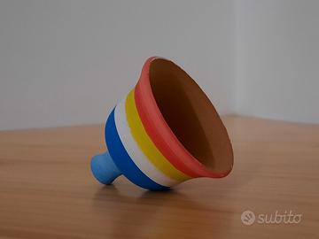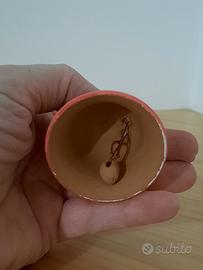 Campanella decorativa dipinta a mano con colori vivaci. In terracotta grezza. Prodotto artigianale, senza cartellino. Diametro 5 cm; altezza 5 cm. Nuova.