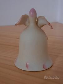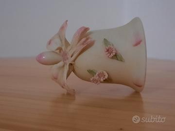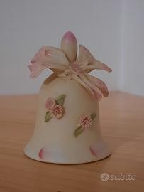 Deliziosa campanella decorativa in ceramica con dettagli di piccoli fiori altamente rifiniti e un elegante fiocco. Molto pregiata: sul risvolto interno il marchio "N: fratelli Majello". Misure in cm: 4xh5,5. Finitura ruvida. Segnalo l'asimmetricità del fiocco: forse mancano delle strisce in basso e di questo il prezzo tiene conto. - Decorata con fiori rosa in rilievo. - Dettagli floreali dipinti a mano. - Finitura color crema con accenti rosa.
