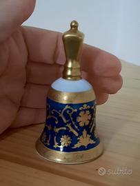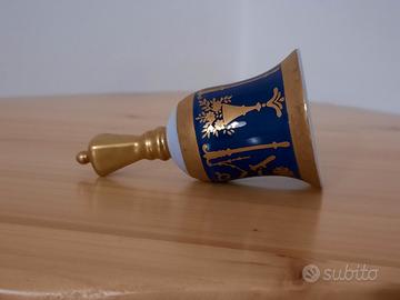 Deliziosa campanella in ceramica con decori floreali dorati su un fondo blu intenso. È un pezzo pregiato della manifattura Meissen. Sul risvolto interno il marchio Paris Royal con le 2 spade icrociate sotto lo stemma coronato. Nuova, perfetta. Misure in cm: 4,5×h7,5. - Design elegante con dettagli dorati. - Motivo floreale oro antico su fondo blu intenso. - Manico dorato a forma di clessidra.