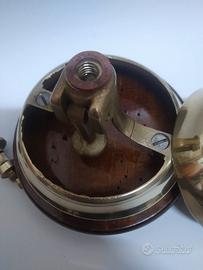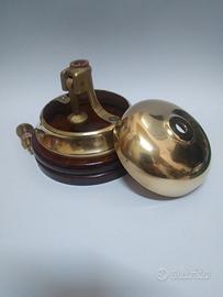 CAMPANELLO DA BANCONE VINTAGE ANNI '50 OTTONE IN STILE BELL DESK, CON BASE IN LEGNO.