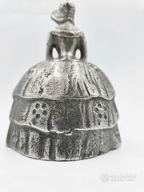 Campanello a forma di signorina vestita in stile Vittoriano con crinolina. Materiale misto zinco. Prodotto in Inghilterra probabilmente negli anni '30-'40. Misure: altezza 13,5 cm,10,5 cm,peso 294 grammi.