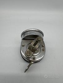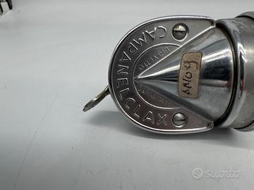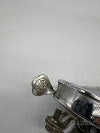 L'oggetto mostrato nell'immagine è un Campanelclax (noto anche come "Rospo"), un particolare tipo di clacson o avvisatore acustico vintage prodotto in Italia e destinato a biciclette classiche e scooter d'epoca come Vespa e Lambretta. Caratteristiche Principali Funzionamento: Si tratta di una "raganella" meccanica che produce un suono caratteristico attraverso un movimento a leva. Design: Presenta un corpo a forma di ogiva in metallo (spesso alluminio o acciaio cromato) con una griglia frontale a fori radiali per la fuoriuscita del suono. Montaggio: È dotato di un morsetto metallico regolabile per essere fissato direttamente al manubrio del mezzo. Questi accessori sono oggi molto ricercati dai collezionisti per il restauro di biciclette d'epoca (modelli sportivi o da passeggio) o per personalizzare moto classiche con un tocco retrò.