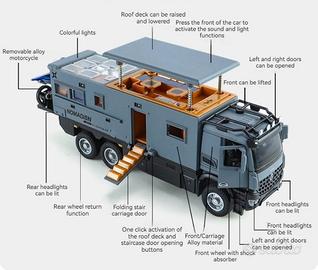 Splendido modellino Nuovo , camion Camping Gray in lega pressofuso , con 2 porte apribili tetto apribile mille aperture , interno riflette tutto l'allestimento camper con tavoli sedie ecc..