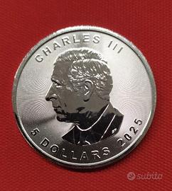 Moneta da 1 oncia d'argento puro del Canada "Foglia di Acero", coniata nel 2025, con l'effige del Re CARLO III.