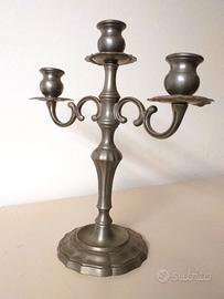 Candelabro vintage (anni '80-'90) in peltro a tre fiamme, finitura satinata. Conservato perfettamente, può presentare qualche piccola imperfezione. Dimensioni cm.31X38. Peso gr. 1.100.