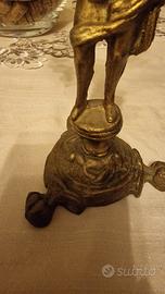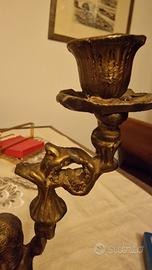 Vendo elegante candelabro vintage a due fiamme, finemente lavorato in ottone (o bronzo). Il pezzo presenta una scultura centrale raffigurante un putto (cherubino) che sostiene i due bracci porta candela a forma di torcia.