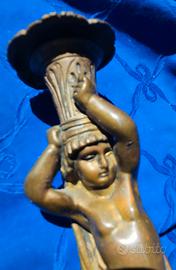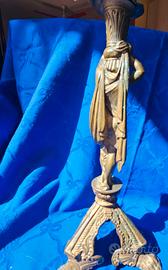 Vendo elegante candeliere figurativo in stile Neoclassico/Impero, realizzato in ottone pieno di notevole peso e consistenza. L'oggetto raffigura un putto (giovinetto) che sorregge una cornucopia fungente da portacandela. La base è finemente decorata a tripode con motivi a fogliame e piedini a zampa ferina. Materiale: Ottone massiccio (molto stabile e pesante). Stile: Luigi XV / Impero. Condizioni: Ottime, pezzo integro, senza mancanze o rotture. Presenta una bellissima patina naturale che ne esalta i dettagli. Epoca: Produzione vintage della seconda metà del '900. dimensioni: 29×11 kg 1.4 Perfetto come complemento d'arredo per scrivanie, camini o librerie dal gusto classico.
