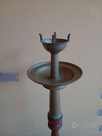 Vendo candeliere vintage in legno tornito, con portacero e piatto in ottone. Tutto originale in condizioni ottime. Altezza totale: 81.
