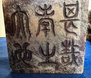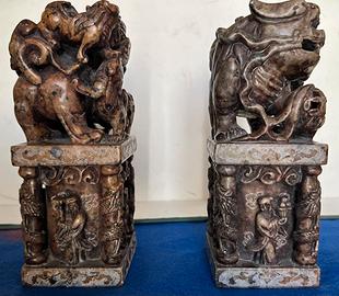 Coppia di sigilli in pietra rappresentanti i cani di Fu. Leoni guardiani cinesi (Shishi), simbolo tradizionale di protezione, scacciando spiriti maligni e energie negative, portando fortuna, ricchezza e armonia.