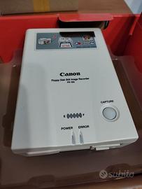 Rarissimo accessorio per videocamere Canon, permette di salvare su floppy le foto scattate: ancora nella confezione originale con tutti il suo cavo di collegamento e alimentatore, e con lo scontrino riportante l'esorbitante prezzo originale di 650.000£.