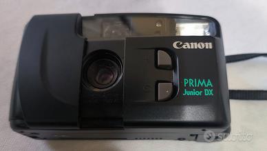 Fotocamera analogica compatta CANON Prima Junior DX. Utilizza pellicola da 35mm. Obiettivo fisso da 32 mm con apertura f/5.6. Flash integrato con diverse modalità. Gestisce automaticamente messa a fuoco ed esposizione, fotocamera di tipo "punta e scatta". Oggetto ricercato da collezionisti.