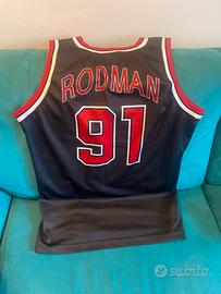 Originale canotta Champion USA dei Chicago Bulls, numero 91 – Dennis Rodman, una vera icona dell’epoca d’oro NBA.