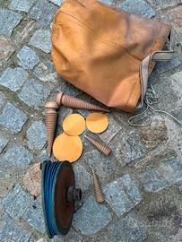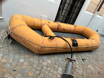 Canotto di salvataggio AM del 1969, completo di accessori originali: remi in alluminio, kit riparazione(toppe e cunei a vite in legno), gonfiatore a mano(serviva a mantenere la pressione), telo intemperie(si fissava con alamari in legno al canotto). Valvole di gonfiaggio in ottone. Tutto in borsa originale. In origine aveva una bombola monouso che lo gonfiava automaticamente quando veniva lanciato in mare, ora al posto della bombola c’e’ un tubo in cui sistemavo l’ancora. Lo ho acquistato nel 1996 per una vacanza su un’isola; usato quell’estate e poi tenuto nella sua sacca inutilizzato da allora. L’ho tirato fuori dalla sua sacca il 2 maggio: gonfiato e fatto le foto che vedete. Un pezzo veramente interessante.