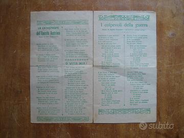 Opuscolo originale, Canzoni Popolari, Firenze, Pilade Salvestrini Editore, 1916, formato circa mm 215 X 122; 8 pagine non numerate. Contiene i testi di canzoni patriottiche di propaganda: La catastrofe dell’esercito austriaco; O vita mia; I colpevoli ella guerra; Addio mia bella addio; Non mi guardar; Il ritorno al fronte; Viva Gorizia italiana; La bella Rina; T’amo; Il martire di Trento Cesare Battisti; Strofe patriottiche; A Francesco Giuseppe; Lettera al fronte; Il saluto alla fidanzata dalla trincea; Il martirio d’un eroe; La campana di S. Giusto. Come da foto, buone condizioni, presenta alcuni ingiallimenti e segni di piegatura a metà.