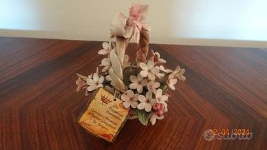Soprammobile in ceramica marchiato Capodimonte: cestino di fiori rosa con fiocco, 12 x 10 cm, altezza 15 cm.