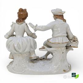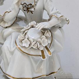 Elegante gruppo scultoreo in porcellana lucida bianca di Capodimonte, raffigurante una coppia rococò del '700: lui galante in tricorno, giacca e pantaloni con cesto di rose bianche; lei seduta con cuffia e mazzo di fiori, in abito vaporoso. Base rocciosa con rose e foglie, scene amorosa giocosa. Marchio classico 'N coronata' (Napoli, Real Fabbrica Ferdinando IV, post-1771).