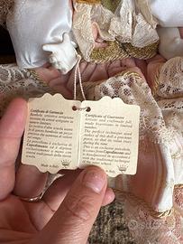Bellissima bambola da collezione in porcellana Capodimonte, realizzata artigianalmente in Italia 🇮🇹 ✨ Pezzo raro e numerato, completo di certificato originale di garanzia. Dettagli: •Viso in porcellana dipinto a mano •Abito ricco di pizzi, dettagli dorati e rifiniture pregiate •Capelli ricci e styling curato •Produzione artigianale in numero limitato 📌 Condizioni: ottime, sempre tenuta con cura 📌 Ideale per collezionisti o come elegante oggetto decorativo vintage 💎 Difficile da trovare in queste condizioni e completa di certificato.