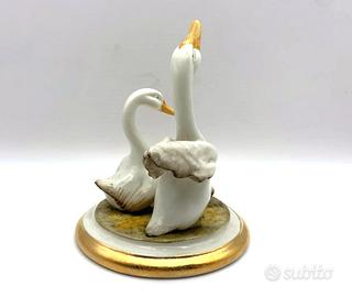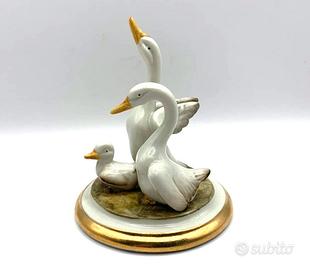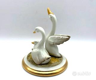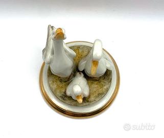 Elegante e realistica Statuina anni 60, della famosa manifattura Italiana di Capodimonte FIGURA : Famiglia di 3 Anatre sul prato MATERIALE: Statua in Porcellana lucida, realizzata e dipinta finemente a mano DIMENSIONE: Altezza 11,5 cm. Circonferenza 9,7 cm. COLORE: Base Bianca con profilo Dorato e tinte sfumate MARCA: CAPODIMONTE originale firmato -Made in Italy STATO: perfettamente NUOVO Nessuna crepa, filettatura o scheggiatura (i riflessi più chiari o scuri, sono l'effetto del flash sulla Statuetta )