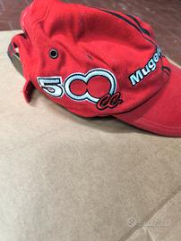Cappellino baseball colore rosso, moto, gp 500, taglia unica, usato in condizioni eccellenti, Mugello 99 Bike gran Prix 500 cc, da un lato riporta la scritta 500 cc, e dall'altro il numero 2, portato sulla moto di Max Biaggi ,con sotto il disegno del circuito del Mugello.