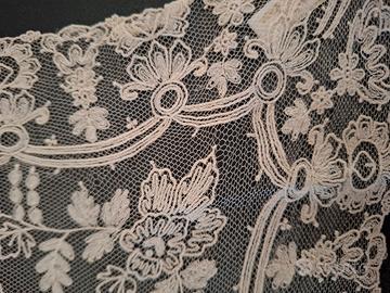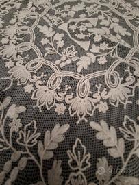 Questo centrino finemente lavorato, con un motivo floreale dettagliato e una bordura smerlata.