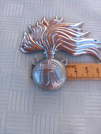 Vendesi fregio originale dell'Arma dei Carabinieri, modello vintage fuori produzione, risalente agli anni '80. Caratteristiche del pezzo: Materiale: Metallo pieno pesante con finitura brunita/argentata di alta qualità (niente plastica o leghe leggere moderne). Dettagli: Granata con fiamma a 13 punte e monogramma "RI" (Repubblica Italiana) ben definito. Tipologia: Modello con fori originali per il fissaggio (sulle punte della fiamma e ai lati della granata), ideale per il montaggio su Crest (targhe in legno), quadri commemorativi o oggettistica da scrivania. Dimensioni: circa 32-33 mm (variante di conio vintage). Stato: Ottime condizioni, conservato con cura, con la patina originale dell'epoca. Pezzo ideale per collezionisti di militaria o per chi desidera restaurare un Crest o una targa d'epoca con componenti originali e coerenti nel tempo