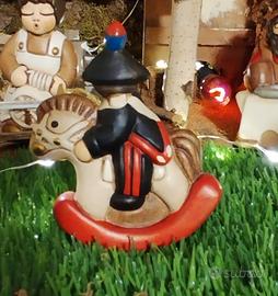 Statuina Thun raffigurante un Carabiniere in alta uniforme su cavallo a dondolo. Pezzo originale, non è un remake. Scatola segnata dal tempo ma integra.