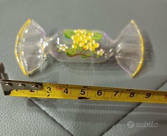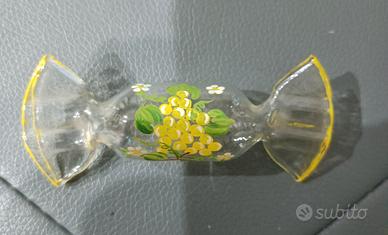 Deliziosa caramella in vetro, dipinta a mano con un motivo floreale giallo e bianco. Un pezzo unico che aggiunge un tocco di colore e artigianalità.