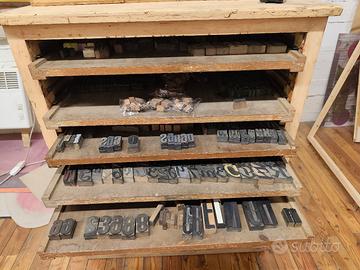 più di mille caratteri tipografici di cui la maggior parte in legno e i restanti in resina vendo in blocco a 500 €. sono misti, di varie dimensioni, lettere e numeri. mobile con ripiani tipografici estraibili regalo ma non spedisco. Spedizione caratteri costerà circa 50€ considerando anche i vari imballaggi per non mischiare tutte le tipologie in un unica scatola