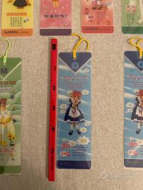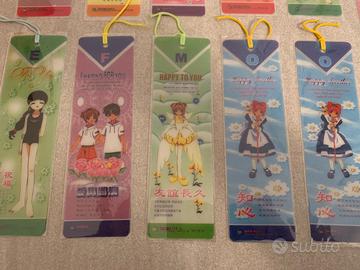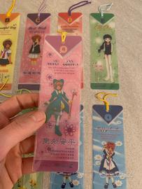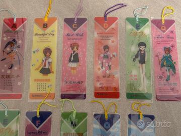 Vendo 11 segnalibri acquistati in fiera della serie Card Captor Sakura. Sono in pvc semi-trasparente protetto da una bustina di plastica aderente e completati da un nastrino colorato.