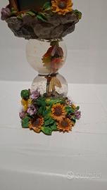 Magnifico carillon decorativo a doppio globo d'acqua, in ottime condizioni come dichiarato. La struttura è riccamente decorata con elementi in resina che richiamano un giardino fiorito, con girasoli, foglie e una casetta con una coccinella in cima. All'interno dei due globi, sono presenti delle figure che sembrano fatine o personaggi fatati, circondati da brillantini che si muovono quando agitato. La base integra il meccanismo musicale che suona la celebre melodia "Per Elisa" (For Elise). Un pezzo da collezione perfetto per gli amanti della decorazione whimsical o del mondo delle fate. Ottimo come idea regalo o come elemento d'arredo unico.