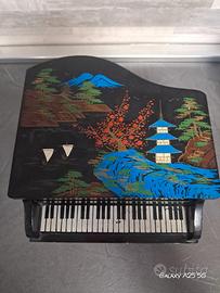Design: Il coperchio è decorato con una splendida pittura in stile lacca giapponese, che raffigura un suggestivo paesaggio con il Monte Fuji, una pagoda e alberi. I tasti del pianoforte sono fissi e aggiungono un tocco di realismo.
