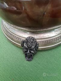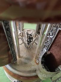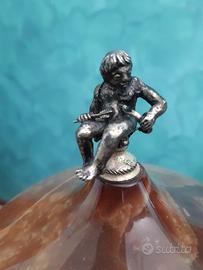 Portasigarette da tavolo con carillon svizzero distribuito in Italia tra il 1960 e il 1979. Questo in particolare è stato acquistato nel 1972. In onice e silver plate, sormontato sulla cima della cupola da un cherubino che suona, h. ca. 35 cm. In origine spingendo il pulsante si attivava il carillon e le porticine giravano su se stesse permettendo di prendere le sigarette al loro interno.