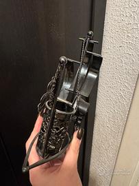 Affascinante carillon vintage da tavolo a forma di veliero realizzato in metallo con lavorazione stile ferro battuto. Il meccanismo musicale originale riporta il marchio Golden Eagle inciso sulla scocca. Il funzionamento è puramente meccanico a molla e non richiede l'utilizzo di pile. Attualmente la melodia viene riprodotta a un ritmo rallentato, probabilmente a causa del lubrificante d'epoca che necessita di una piccola revisione o pulizia degli ingranaggi. La struttura decorativa è integra e include un elemento cilindrico traforato utilizzabile come portapenne o portasigarette. Un pezzo di modernariato autentico ideale per collezionisti o amanti del restauro.